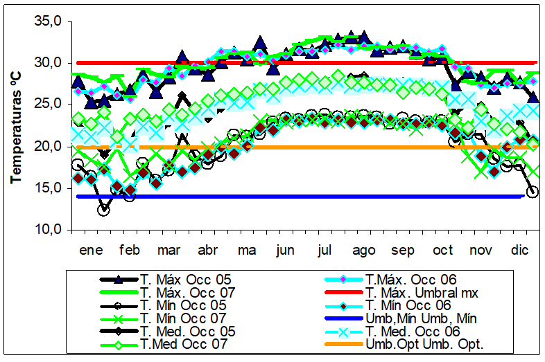 Se realizó una evaluación agrometeorológica, decadal y mensual de los indicadores, de las temperaturas, humedad relativa del aire, viento medio, insolación y lluvia por regiones, debido a la influencia que ejercen las condiciones meteorológicas sobre la producción apícola, en los años 2005, 2006 y 2007. El año 2005 fue “muy desfavorable” predominaron temperaturas muy cálidas, bajo índice de humedad relativa del aire, viento medio muy alto, una alta insolación y bajos acumulados de lluvia, provocando una disminución en la producción de miel llegando a un 38% con relación al año anterior, siendo la producción más baja de toda la historia por otra parte se elevo el numero de perdidas en las colmenas hasta un 11%, provocado fundamentalmente por el déficit hídrico en el período poco lluvioso y en el lluvioso por la activa temporada ciclónica que afecto a Cuba, que provocó muertes en los apiarios en un 3%. En el año 2006 las temperaturas y la humedad relativa del aire fueron altas, baja fuerza de viento, alta insolación y altos acumulados de lluvia que resultaron ser “favorables”, aumentando la producción apícola a un 82% con relación al año anterior y las perdidas en las colonias disminuyeron a un 3,7%. El año 2007 fue moderado aunque algunos indicadores fueron similares a los del 2006, pero con los abundantes acumulados de lluvias originados por la Tormenta Tropical Noel, en las provincias orientales la producción decreció en un 10% a nivel nacional y las muertes en las colonias se elevaron a un 7,9%.
